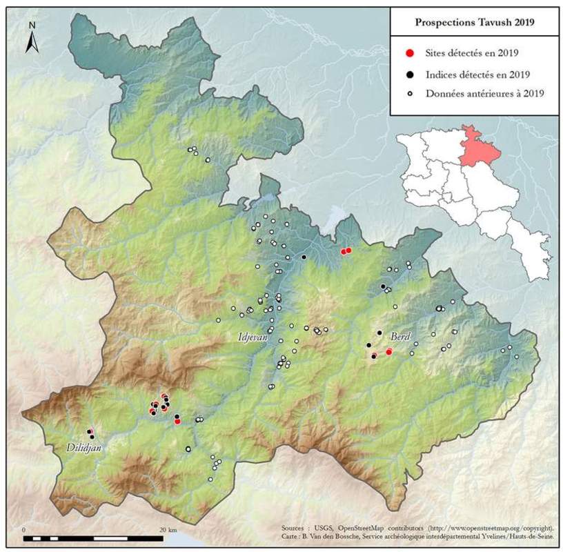 La campagne 2019 a permis de découvrir et/ou documenter 32 nouvelles entités. Celles-ci se répartissent entre la périphérie de l’agglomération de Dilidjan, au sud, et la zone de piémont qui marque la bordure orientale du Tavush. Les découvertes couvrent un large spectre chronologique allant du Bronze ancien (début du IIIe millénaire av. J.-C.) au XIXe siècle. Parmi ces découvertes, treize correspondent à des sites avérés, c’est-à-dire des ensembles pour lesquels on dispose à la fois d’objets archéologiques et d’aménagements structurés, visibles en surface. Les dix-neuf restantes sont considérées comme de simples indices qu’il est très difficile de dater et de caractériser avec précision.