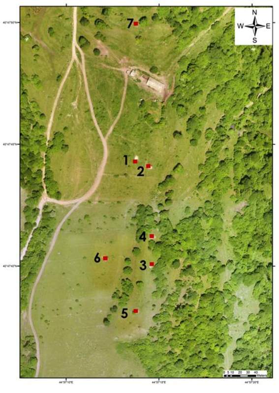 En 2018, les recherches avaient privilégié des zones situées dans la vallée de l’Aghstev. Cette année, les efforts ont préférentiellement porté sur les secteurs de moyenne montagne (600-1 600 m), éloignés des centres urbains actuels. Occupés par des pelouses d’altitude, ils sont exploités par les éleveurs qui y laissent paître leurs troupeaux. Ces terrains accidentés à la végétation basse se prêtent généralement bien à la détection de vestiges archéologiques par des moyens conventionnels. Ils ont donc été volontairement ciblés de manière à ne pas focaliser l’attention sur les seuls fonds de vallée.