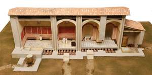 Cette belle maquette reconstitue la villa gallo-romaine fouillée à Richebourg (78), au milieu des années 90. Il s'agit d'un domaine agricole installé quelques années après la Conquête et qui s'est développé jusqu'au IIIe siècle. Cette restitution présente l'état de la pars urbana au 1er siècle de notre ère.