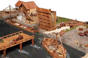 Cette maquette représente les quais animés d’un petit port de commerce, installé sur les bords de Seine au Ier siècle de notre ère. Elle offre une hypothèse de restitution des quais fouillés aux Mureaux (78), rue des Gros Murs, au milieu des années 80.