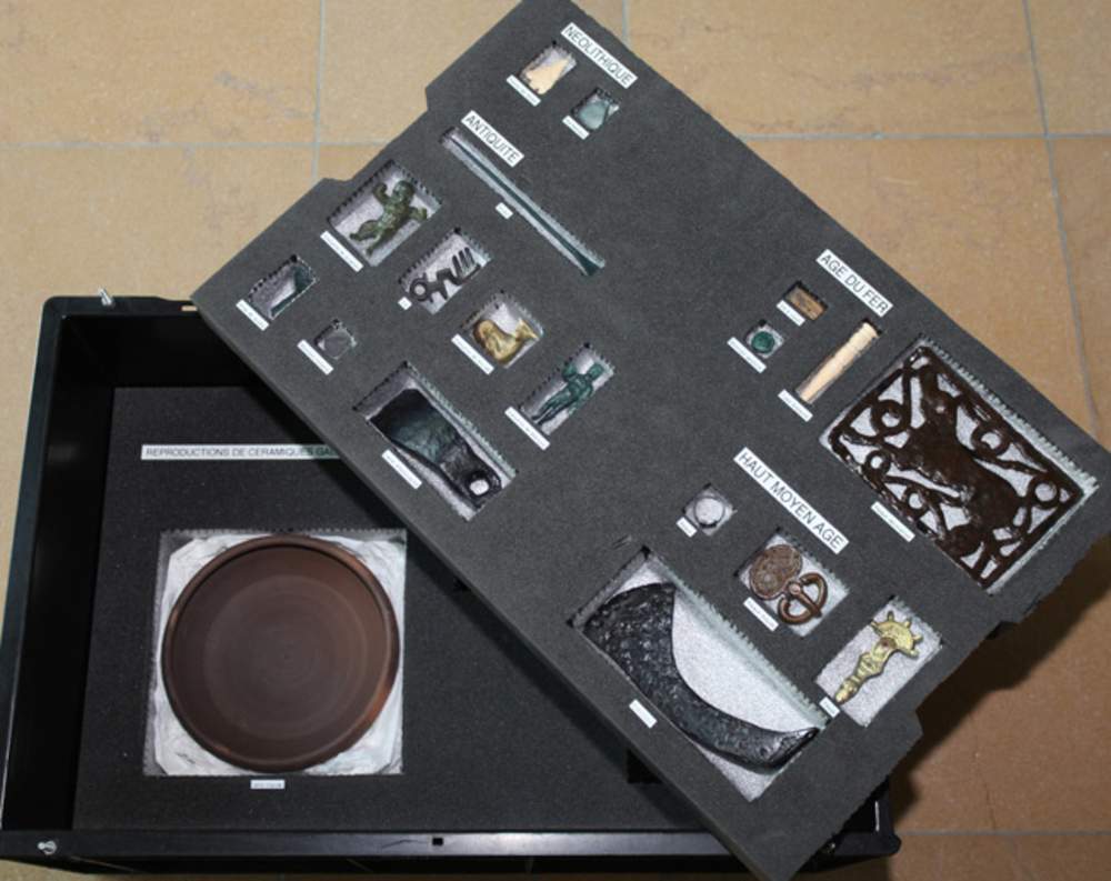 Les panneaux sont accompagnés d’une caisse contenant 21 copies d'objets archéologiques à manipuler (moulages en résine et restitutions de céramiques). Chaque objet possède une "fiche d'identité" détaillée et un cartel à installer.